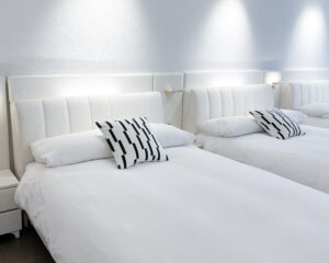 보통의 레지던스나 파티룸도 침대 4개를 갖춘 곳은 드뭅니다. 하지만 오아시스 홍대 센트럴의 시그니처 객실은 광활한 원룸형 구조에 더블 침대 4개가 나란히 놓여 있습니다.