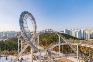 계단을 따라 굽이굽이 엮인 스페이스워크의 꼭대기에 오르면, 영일대의 짙은 바다와 시내의 풍경이 파노라마처럼 시원하게 펼쳐집니다.